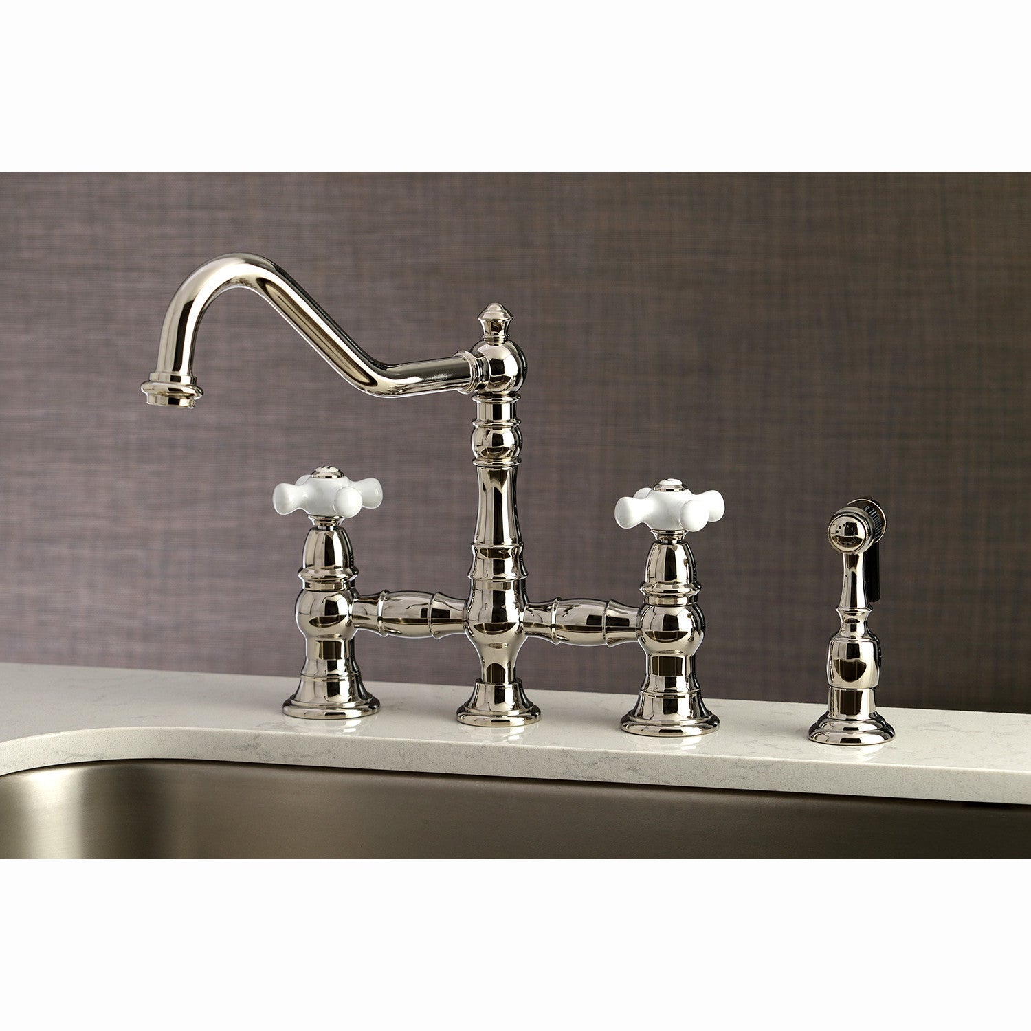 Restoration KS3276PXBS Two-Handle 4-Hole Deck Mount Bridge Kitchen Faucet with Side Sprayer, Polished Nickel