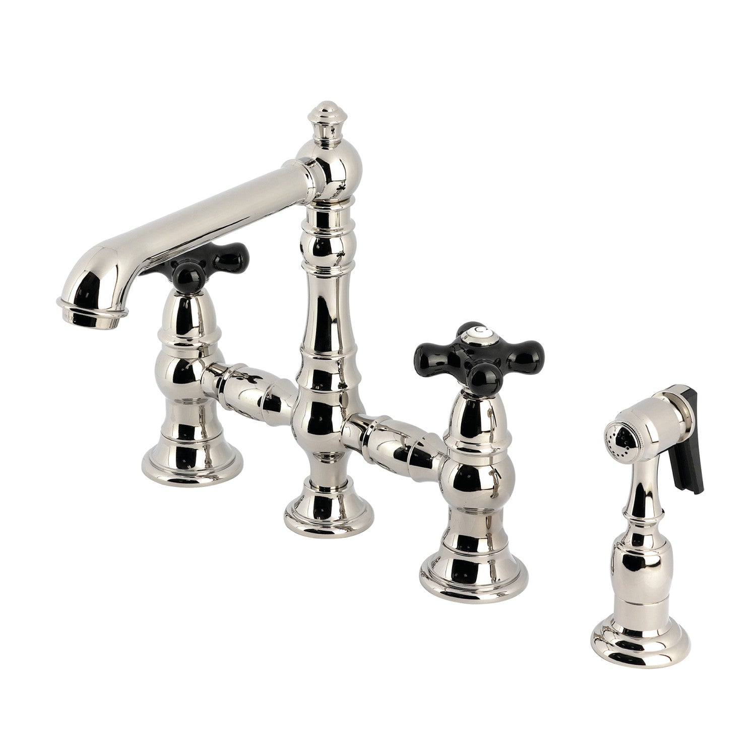 Crafted inspired by English nobility, the exemplary design of this faucet manifests regality and elegance with its black porcelain handles. Allow the brass construction, side sprayer, and swivel spout to provide a sturdy and reliable fixture, great for use with any sink. If you are striving for a Victorian-inspired kitchen, this unique bridge design is a highly favored option amongst those doing period-style kitchens. Because of its added architectural elements and detailing, the stunning finish will pop against your surrounding kitchen decor.