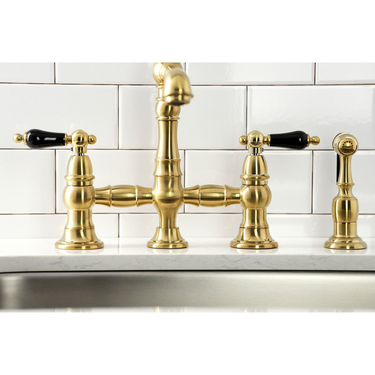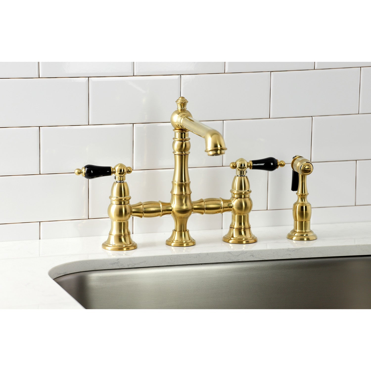 Crafted in commendations to English nobility, the exemplary design of this faucet manifests regality and elegance with its black porcelain handles. Whether you are striving for a Victorian-inspired kitchen or a vibrant 1950s-themed space, the unique bridge design is a highly favored option amongst those doing period-style kitchens. Because of its added architectural elements and detailing, the brushed brass finish will pop against your surrounding kitchen decor. Allow the brass construction, side sprayer, and swivel abilities to provide a sturdy and reliant fixture, great for use with any sink.
