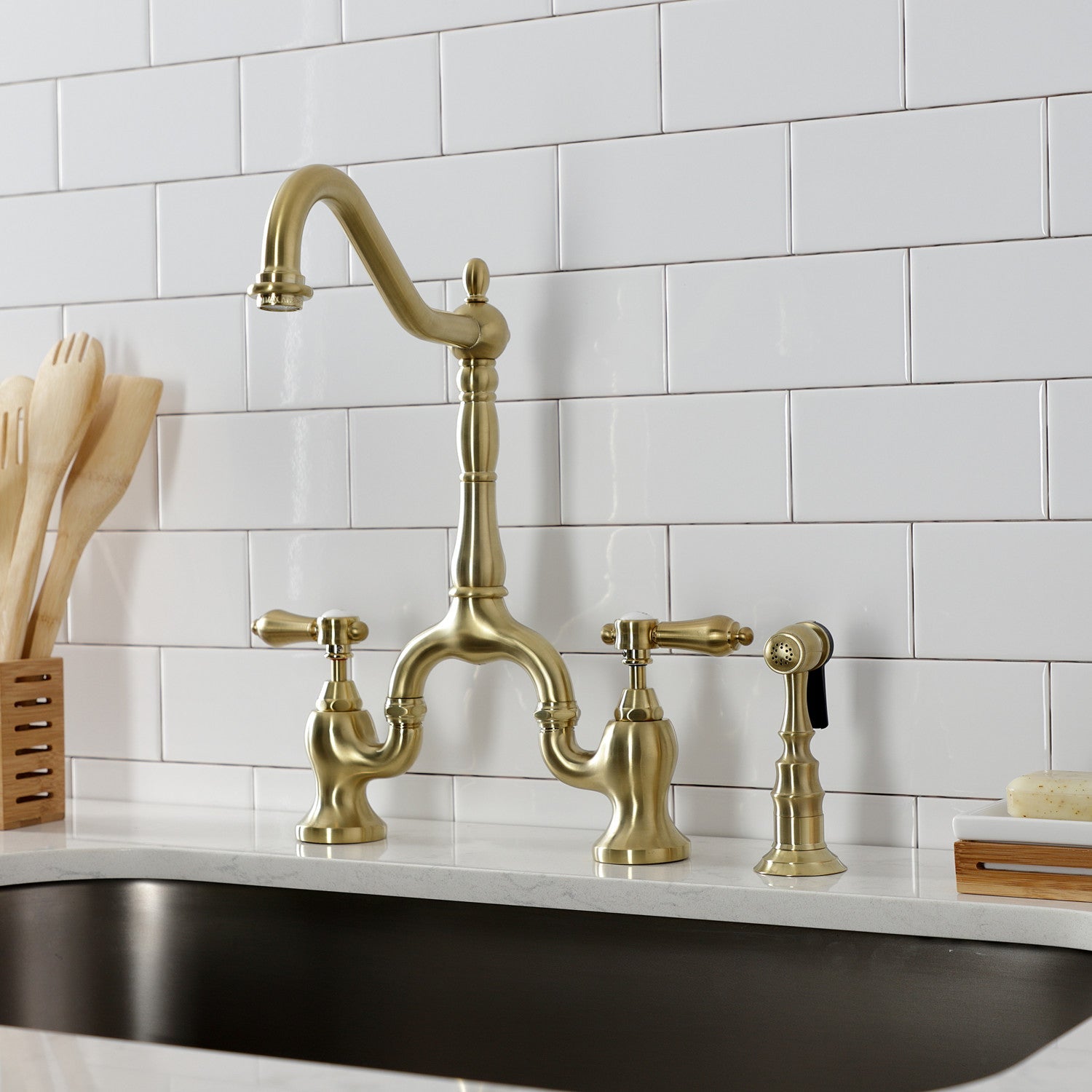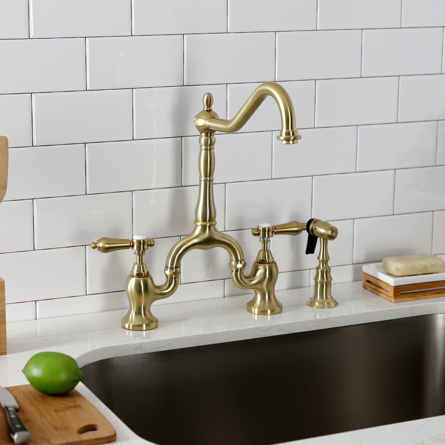 Heirloom KS7757BALBS Two-Handle 3-Hole Deck Mount Bridge Kitchen Faucet with Brass Sprayer, Brushed Brass