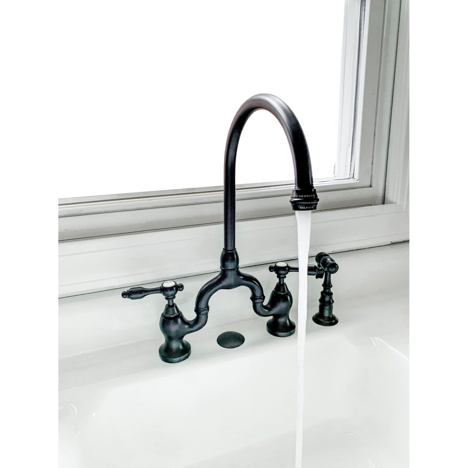 Offering a nod toward the past, this faucet is beautifully inspired by the vintage elegance of mid-19th Century design. Whether you are striving for a Victorian-inspired kitchen or a vibrant 1950s-themed space, the unique bridge design is a highly favored option amongst those doing period-style kitchens. Because of its added architectural elements and detailing, the oil rubbed bronze finish will pop against your surrounding kitchen decor. Allow the brass construction, side sprayer, and swivel abilities to provide a sturdy and reliant fixture, great for use with any sink.