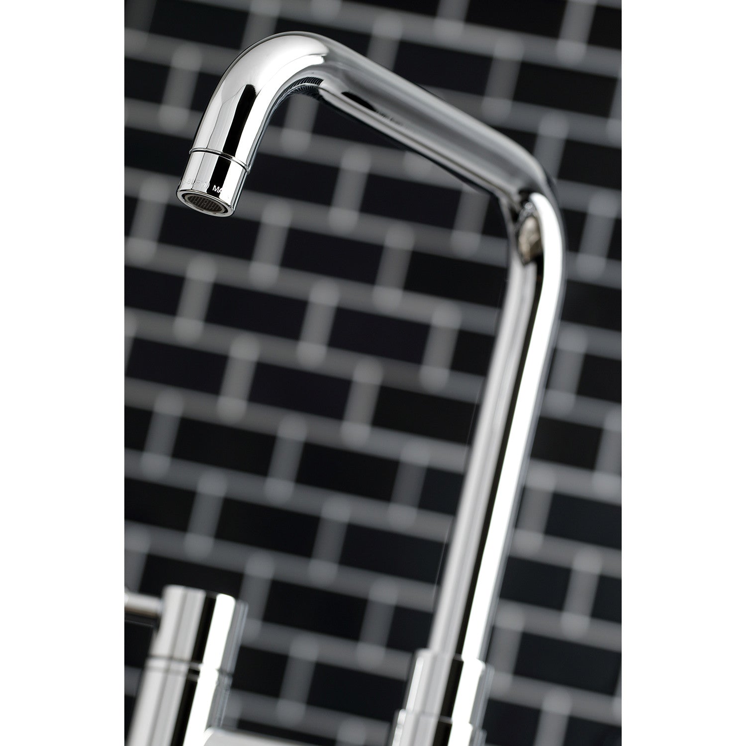 This faucet boasts bold, sleek design with its cylindrical styling. While bridge faucets typically have a traditional appeal, this particular design is a more modern interpretation. Allow the polished chrome finish to pop against your surrounding kitchen decor due to the added architectural elements. The brass construction and swivel abilities provide a sturdy and reliant fixture, great for both dual and single bowl sinks. Utilize the included matching finish side-sprayer for convenience in cleaning hard-to-reach areas.