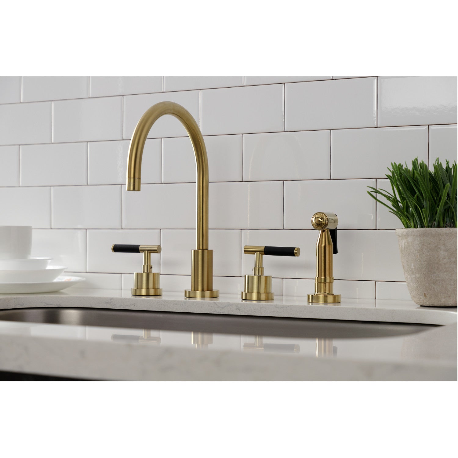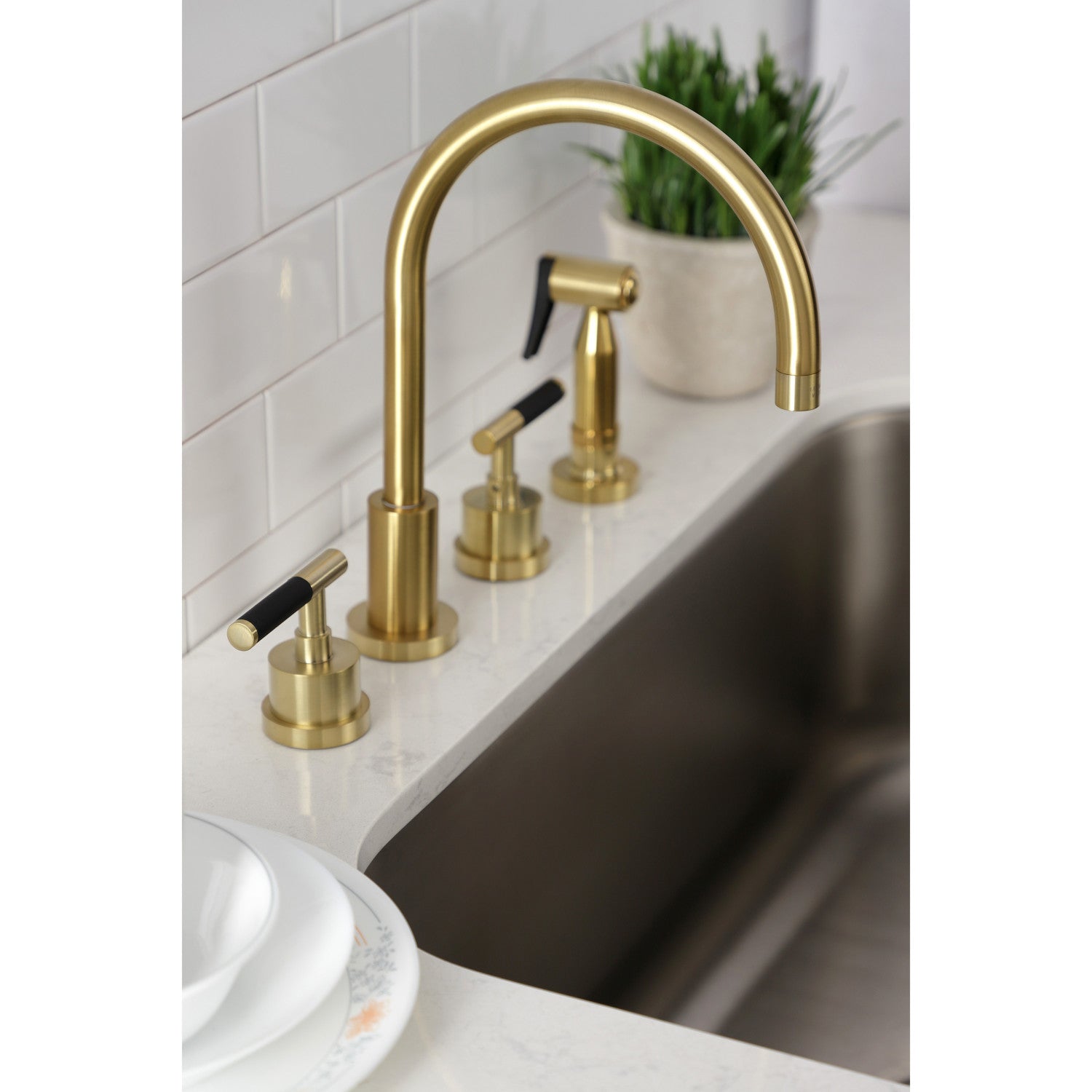 Kaiser KS8727CKLBS Widespread Kitchen Faucet with Brass Sprayer, Brushed Brass