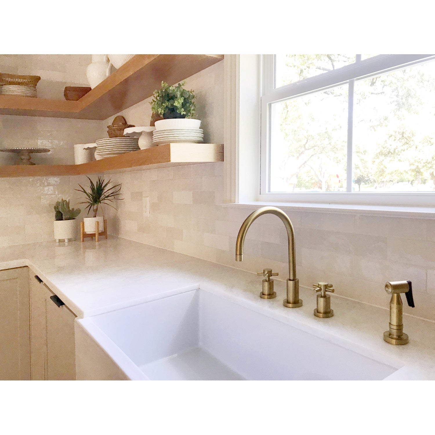 This faucet boasts bold, sleek design with its cylindrical styling. Able to fit a variety of sink set-ups, widespread kitchen faucets can be utilized in several multi-hole configurations. These are ideal for larger kitchens, as they are more spread apart, and with the included side-sprayer feature a 4-hole installation. The brushed brass finish will also provide a long lasting and warm touch to your kitchen ensemble. Allow the brass construction to provide a sturdy and reliant fixture.
