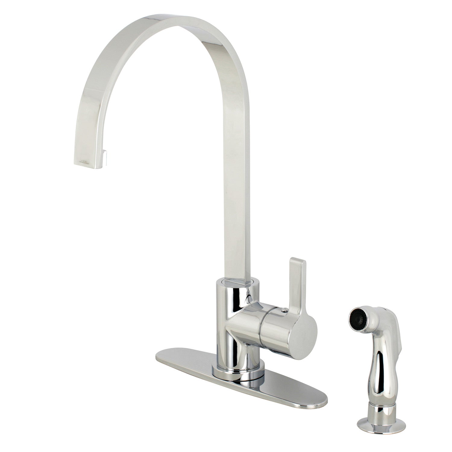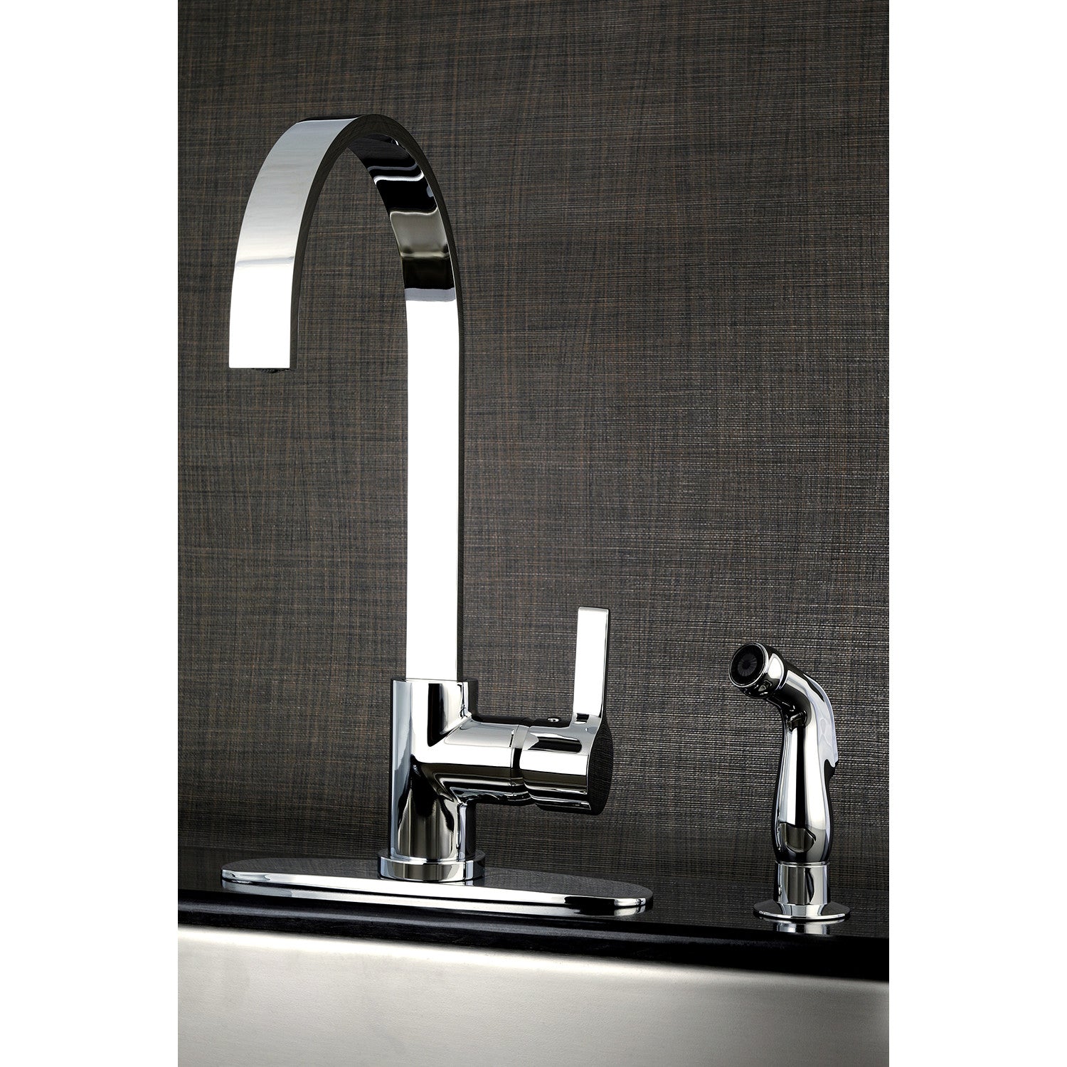Transcend your home into a futuristic utopia with this faucet's brilliant craftsmanship and modern, curved spout with ergonomic levers. Easily adaptable to any kitchen, the Continental single-handle kitchen faucet with side sprayer is prized for its easy-to-use single-handle. This makes it the perfect fixture for multitasking as you can adjust temperature and volume in one swipe. Enjoy the strong and durable brass material and polished chrome finish that will last for years to come. The included matching finish side-sprayer also adds convenience in cleaning hard-to-reach areas.