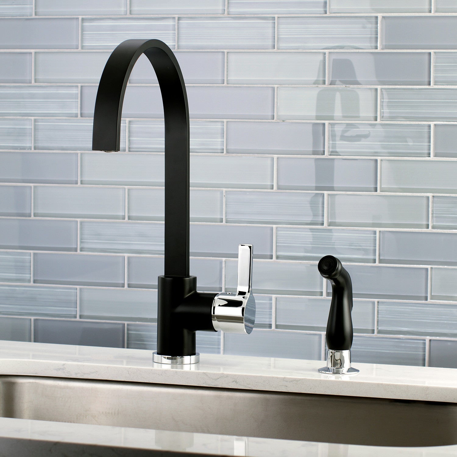 Transcend your home into a futuristic utopia with this faucet's brilliant craftsmanship and modern, curved spout with ergonomic levers. Easily adaptable to any kitchen, the Continental single-handle kitchen faucet with side sprayer is prized for its easy-to-use single-handle. This makes it the perfect fixture for multitasking as you can adjust temperature and volume in one swipe. Enjoy the strong and durable brass material and matte black/polished chrome finish that will last for years to come. The included matching finish side-sprayer also adds convenience in cleaning hard-to-reach areas.