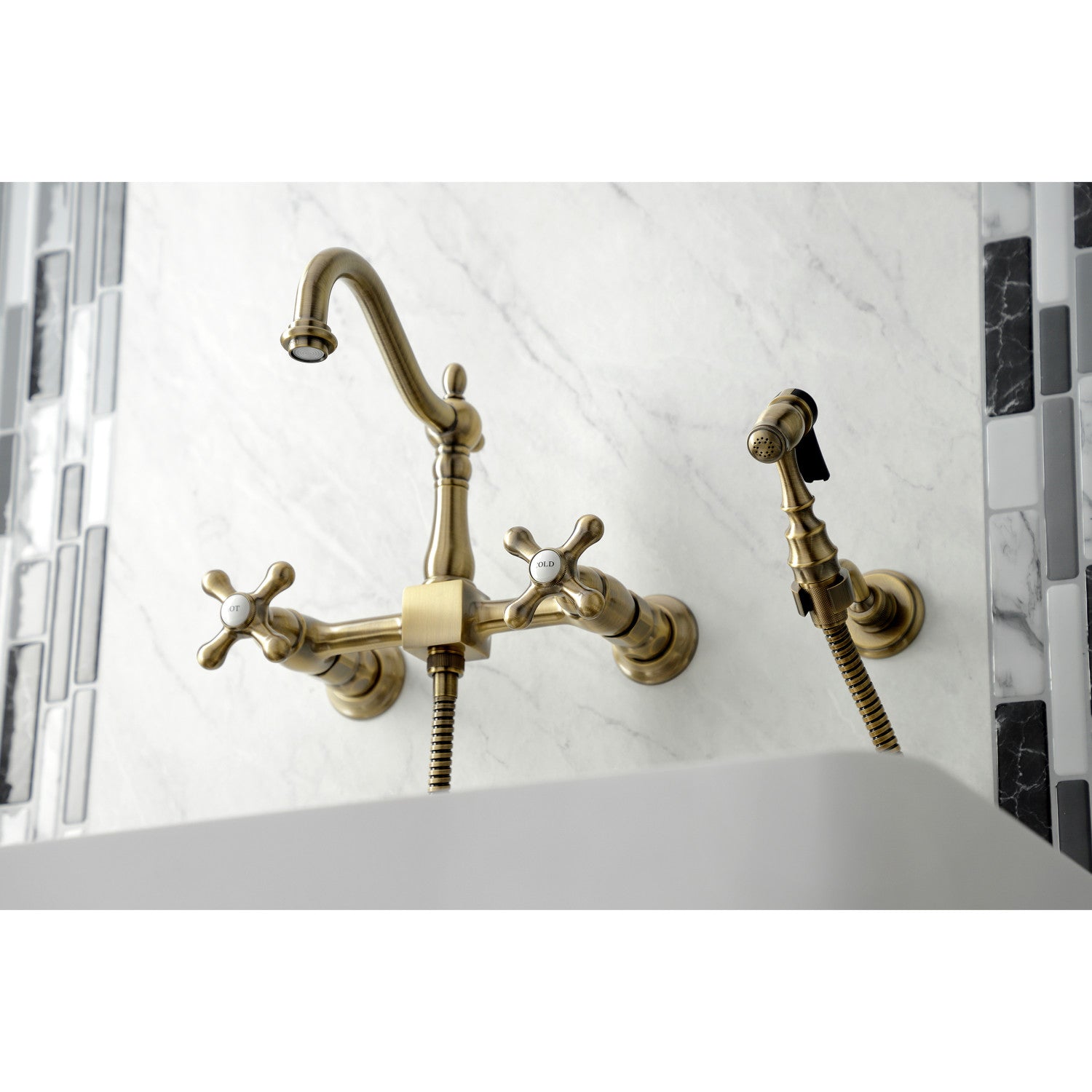 Kingston Brass KS1263AXBS Heritage Wall Mount Bridge Kitchen Faucet with Brass Sprayer, Antique Brass