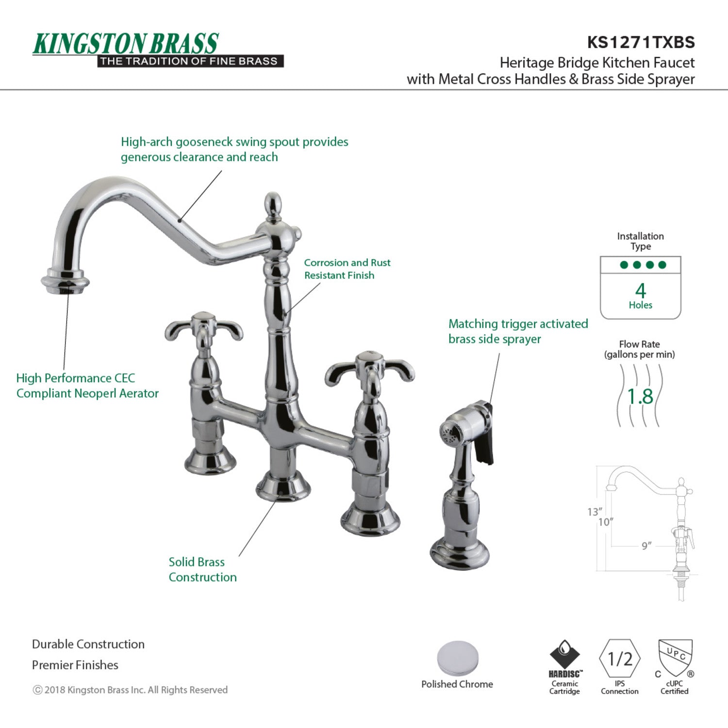 Kingston Brass KS1271TXBS French Country Bridge Kitchen Faucet with Brass Sprayer, Polished Chrome