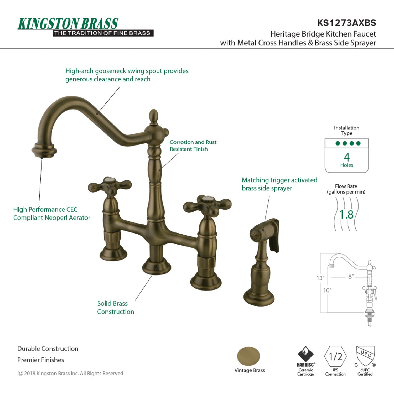 Kingston Brass KS1273AXBS Heritage Bridge Kitchen Faucet with Brass Sprayer, Antique Brass