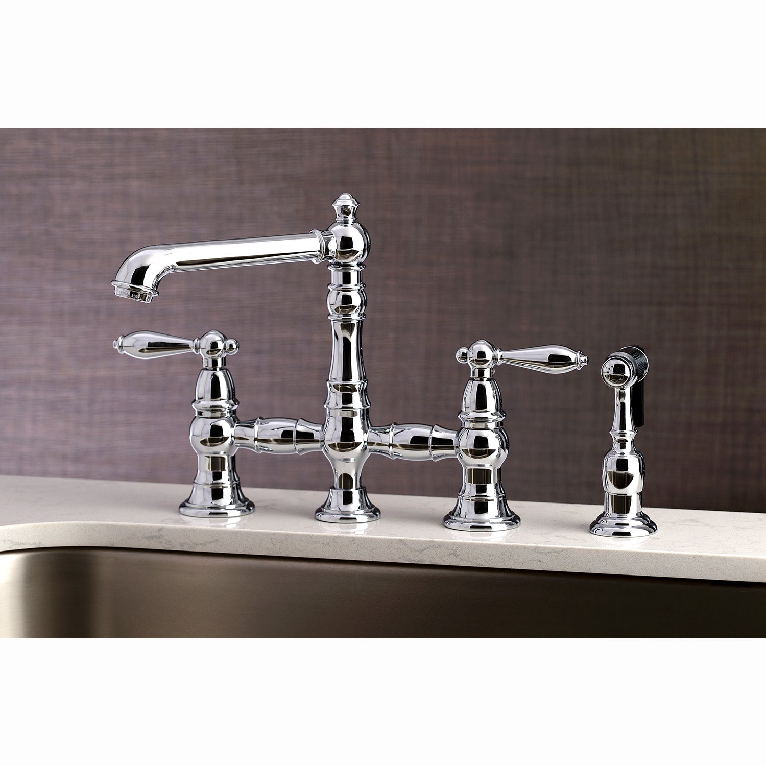 Embody the extravagance of 18th century Europe by adorning your house with the traditional elegance offered by this faucet. Whether you are striving for a Victorian-inspired kitchen or a vibrant 1950s-themed space, the unique bridge design is a highly favored option amongst those doing period-style kitchens. Because of its added architectural elements and detailing, the polished chrome finish will pop against your surrounding kitchen decor. Allow the brass construction, side sprayer, and swivel abilities to provide a sturdy and reliant fixture, great for use with any sink.