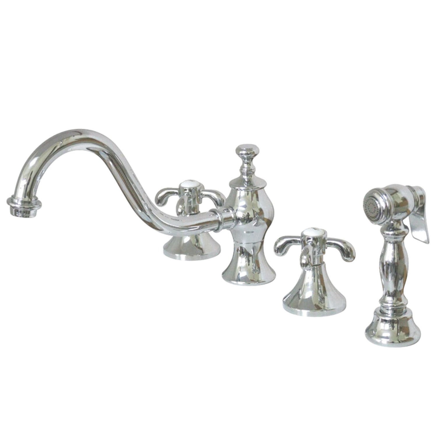 The dainty detailing of this faucet provides the delicacy of European antiquity along with top-of-the-line craftsmanship. Able to fit a variety of sink set-ups, widespread kitchen faucets can be utilized in several multi-hole configurations. These are ideal for larger kitchens, as they are more spread apart, and with the included side-sprayer feature a 4-hole installation. The polished chrome finish will also add a glistening elegance to your kitchen ensemble. Allow the brass construction to provide a sturdy and reliant fixture.