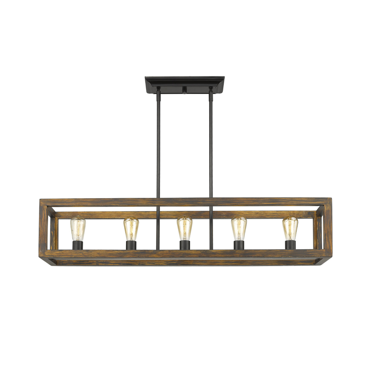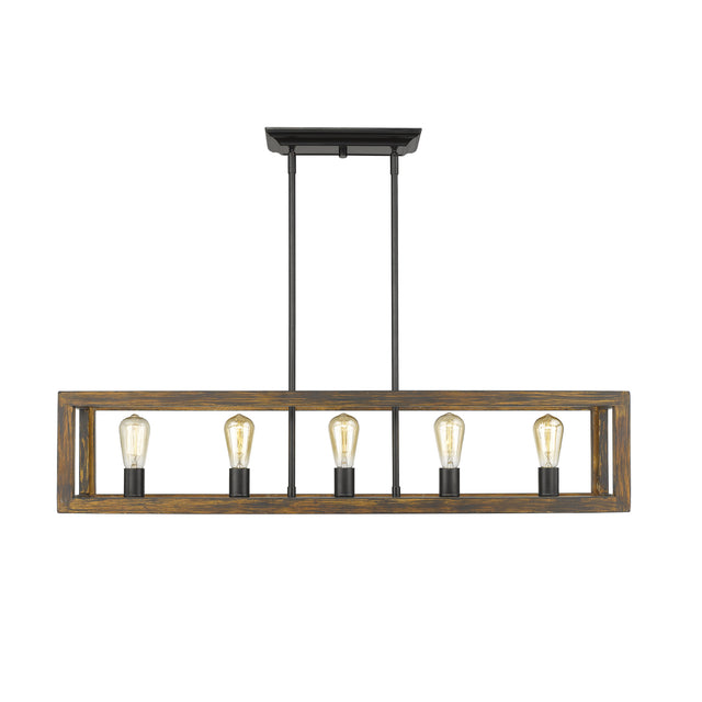 Sutton is a modern but rustic collection with a smooth matte black cluster and wooden cage. The farmhouse-chic look is enhanced by the exposed medium-based bulbs inside the rugged wood frame. Complete the look by installing trendy, Edison Bulbs. This 5-light linear pendant's open-cage and ambient light makes it perfect for elongated bar, dining table, or kitchen island.