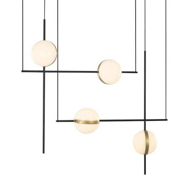 The Tagliato LED 4 Light Linear Suspension. A contemporary mix of bold design and understated finishes, an array of smooth, Metal cables drop down from a bar ceiling mount and hold 4 Opal acrylic spherical shades. Bisected by seamless rings, the diffusers mellow glare at every angle from the energy-efficient LEDs within them, creating a pleasantly bright environment around the fixture.