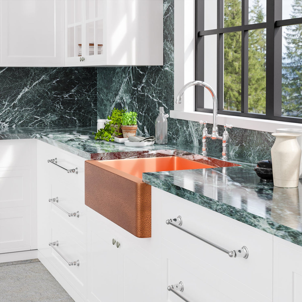 With its spacious single well design, smooth interior, and hammered exterior, this sink will be a welcomed addition to any kitchen. Its antique copper patina finish is applied using an authentic French hot process which lends the entire ensemble distinguished elegance. The distinct contrast from smooth interior to hammered exterior adds fashion-forward design to your home.