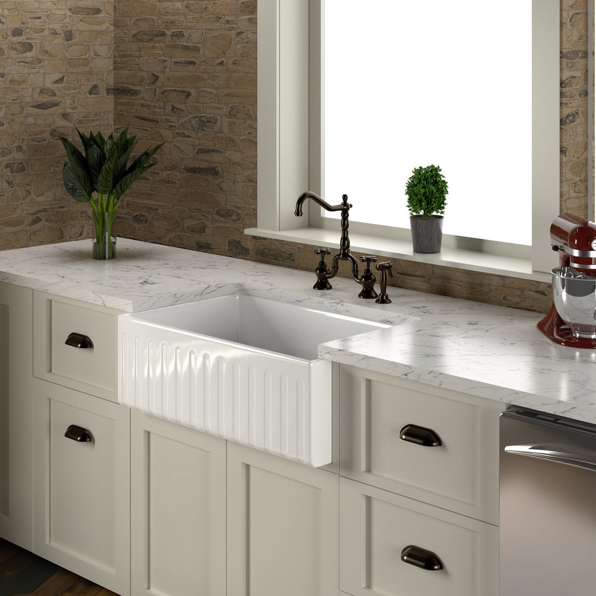 - Single bowl with fluted apron front