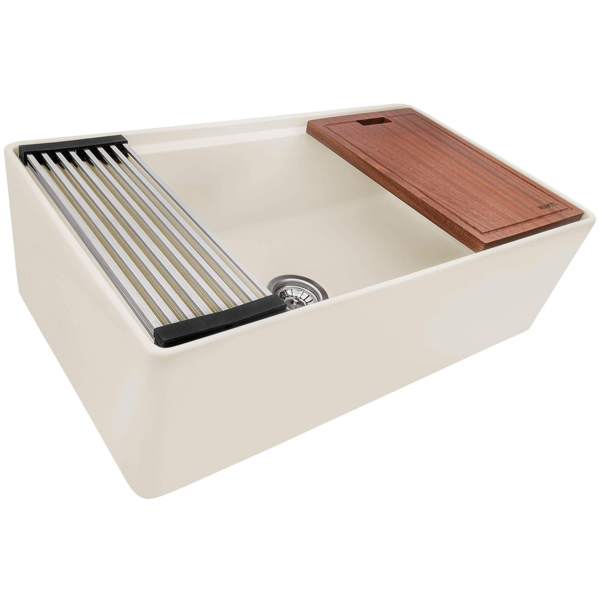- INCLUDED IN BOX: Fireclay sink, solid hardwood cutting board, foldable drying rack, bottom rinse grid, basket strainer drain assembly.