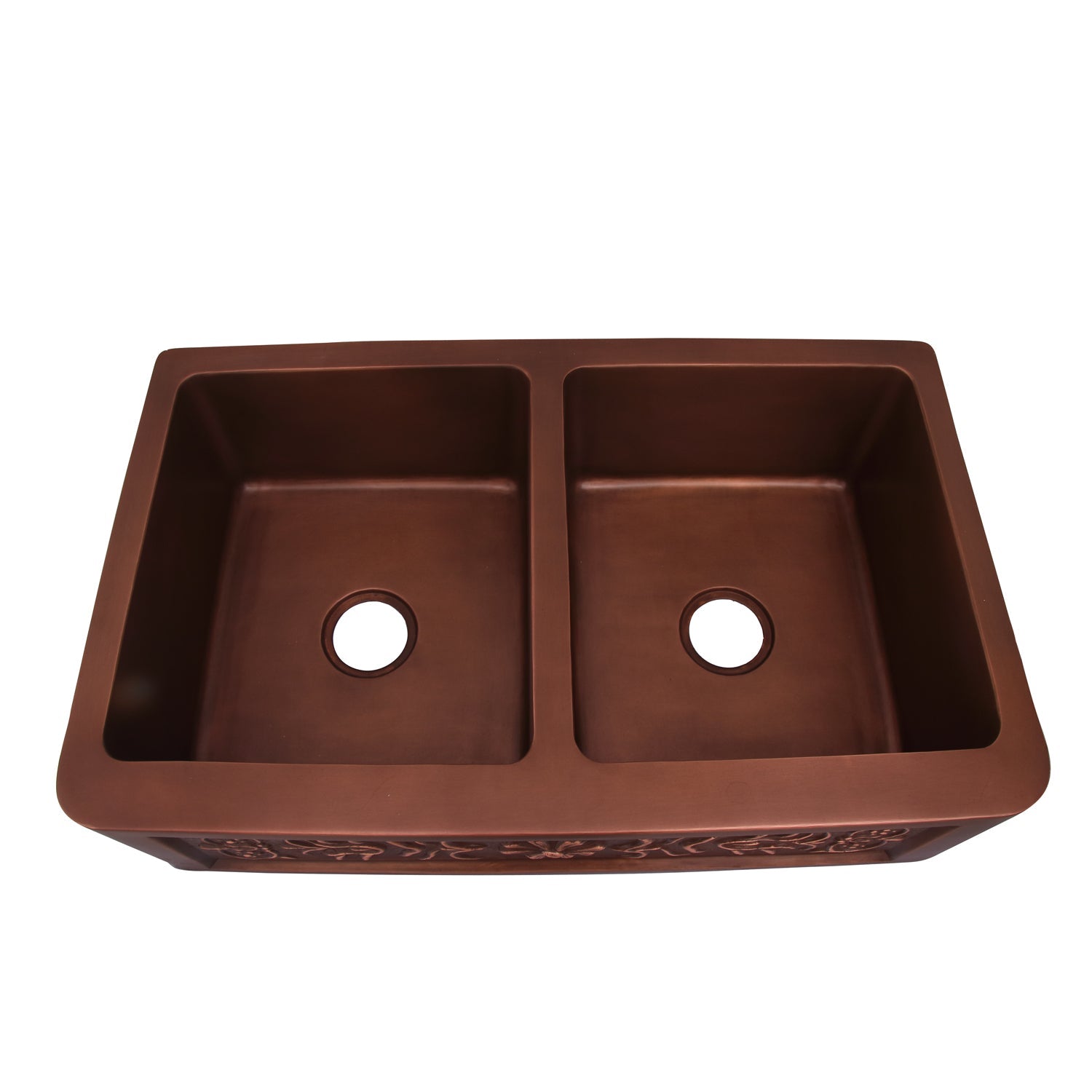 This copper apron-front sink features two spacious bowls which are ideal for food preparation. The inside rounded corners make cleaning smooth and quick. Its solid construction and decorative floral front work together to present an ensemble that is at once durable and stylish.