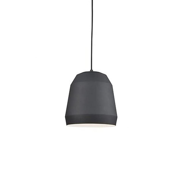 Single-lamp pendant with faceted aluminum shade showcasing powder-coated finishes against a matte white interior. Exterior shade colors are black or gray. Suspended by cloth cable. Available in two sizes.