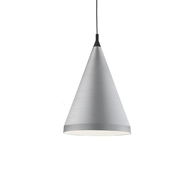 Single lamp pendant with conical aluminum shade with fine powder-coated or plated finishes with contrasting finial. Exterior shade colors are black or white with gold detail or brushed nickel with black detail. Suspended by cloth cable. Available in 3 sizes.