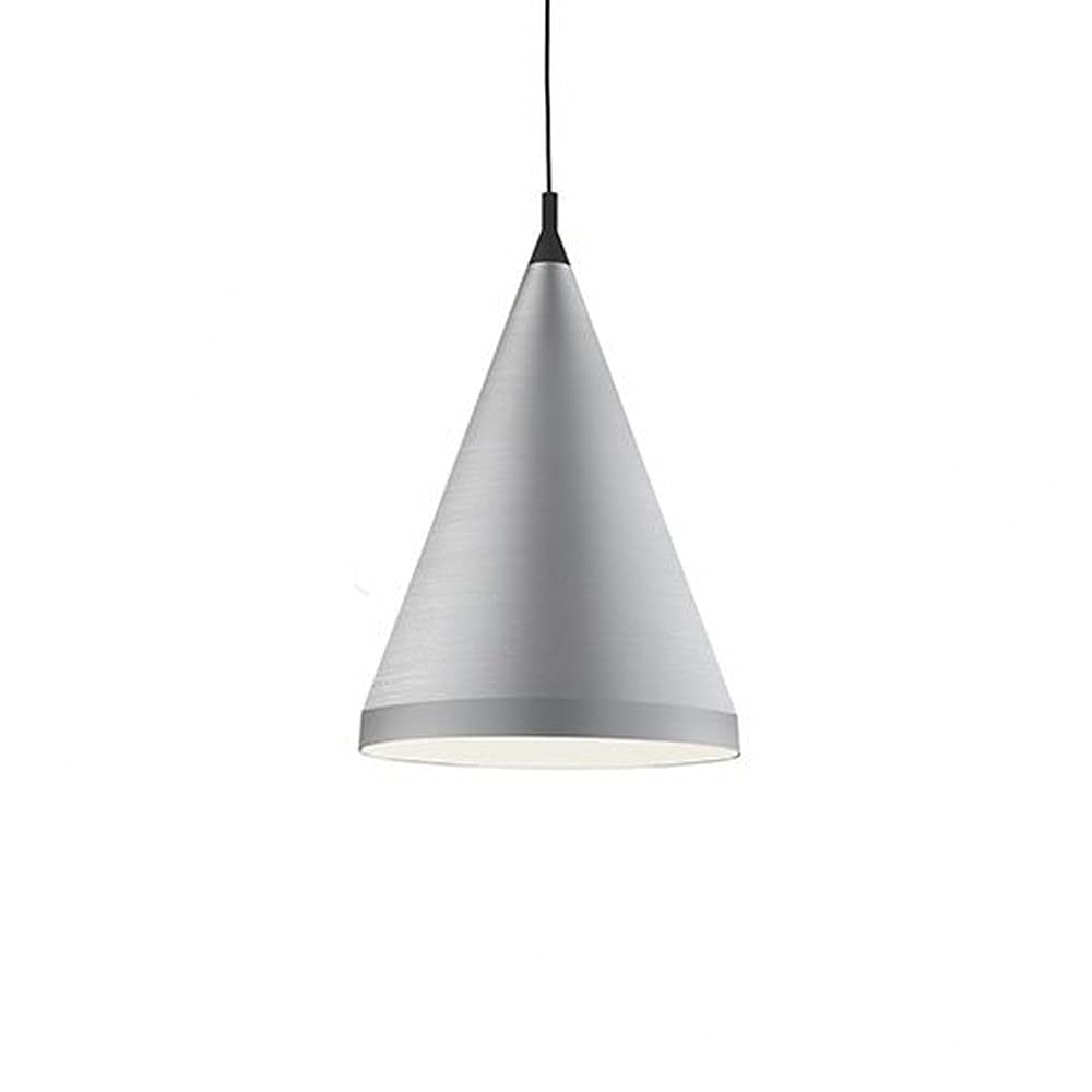 Single lamp pendant with conical aluminum shade with fine powder-coated or plated finishes with contrasting finial. Exterior shade colors are black or white with gold detail or brushed nickel with black detail. Suspended by cloth cable. Available in 3 sizes.