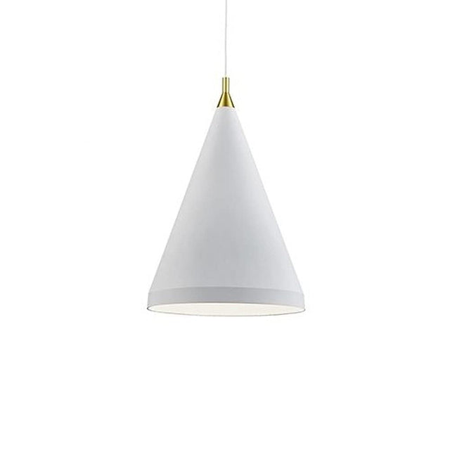 Single lamp pendant with conical aluminum shade with fine powder-coated or plated finishes with contrasting finial. Exterior shade colors are black or white with gold detail or brushed nickel with black detail. Suspended by cloth cable. Available in 3 sizes.