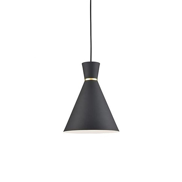 Single-lamp pendant with conical aluminum shade with fine powder-coated finishes and anodized gold ring detail. Exterior shade colors are white or black, with matte white interior. Suspended by cloth cable