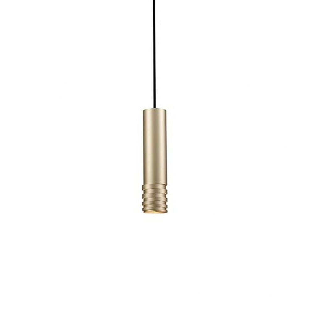 Single lamp pendant with steel cylindrical shade embellished by stacked tubular slices. Primary color configurations include black, gray, brushed nickel or gold with a matching interior. Suspended by a black Teflon cable