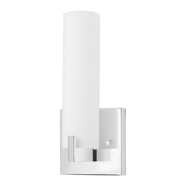 Single lamp LED wall sconce with white opal glass cylinder, metal details in brushed nickel, chrome or bronze finish and is equipped with our powerful 120V AC LED technology,