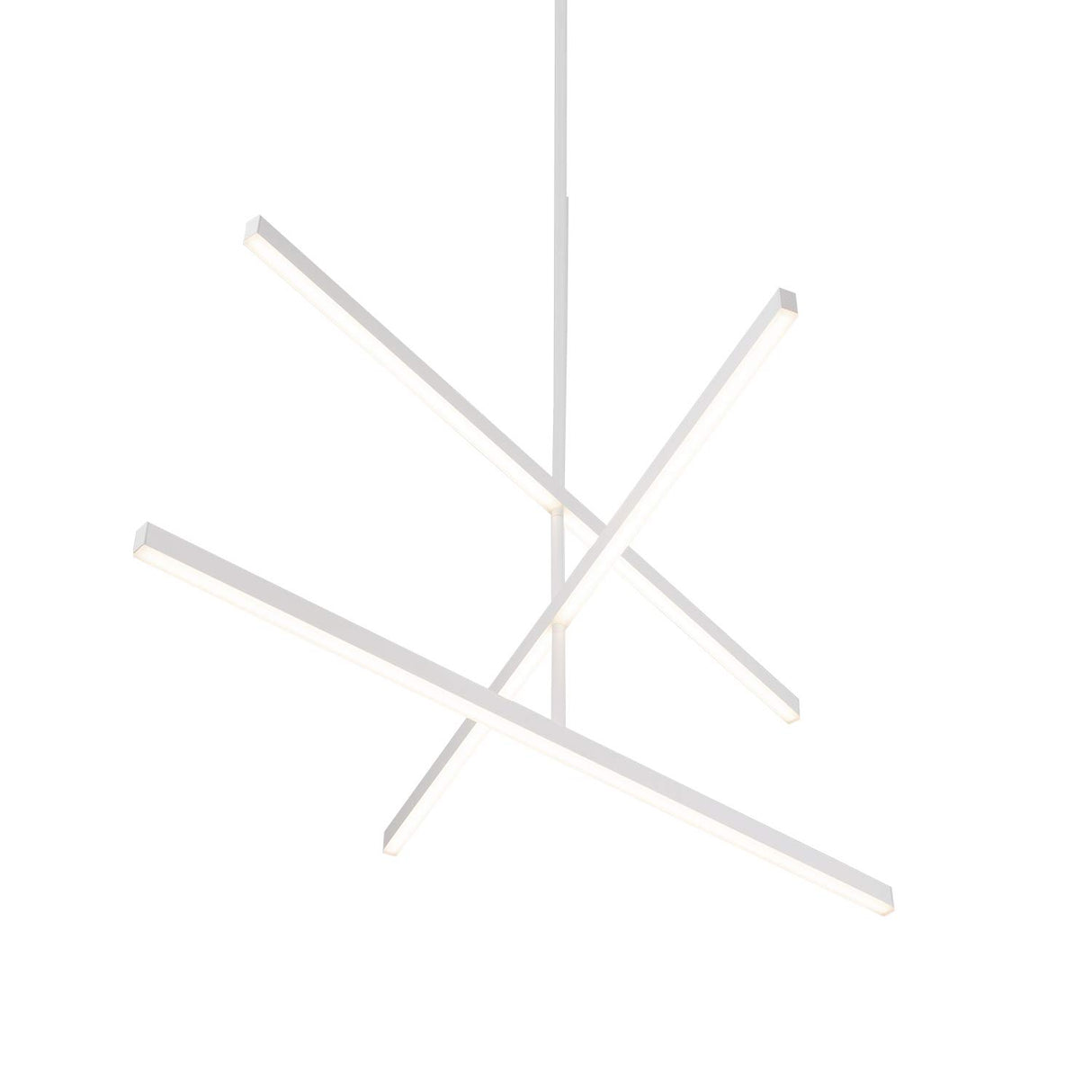 Machined aluminum with powder-coated or electroplated finish. Trio of linear lights, suspended from a central spindle. Down light distribution.