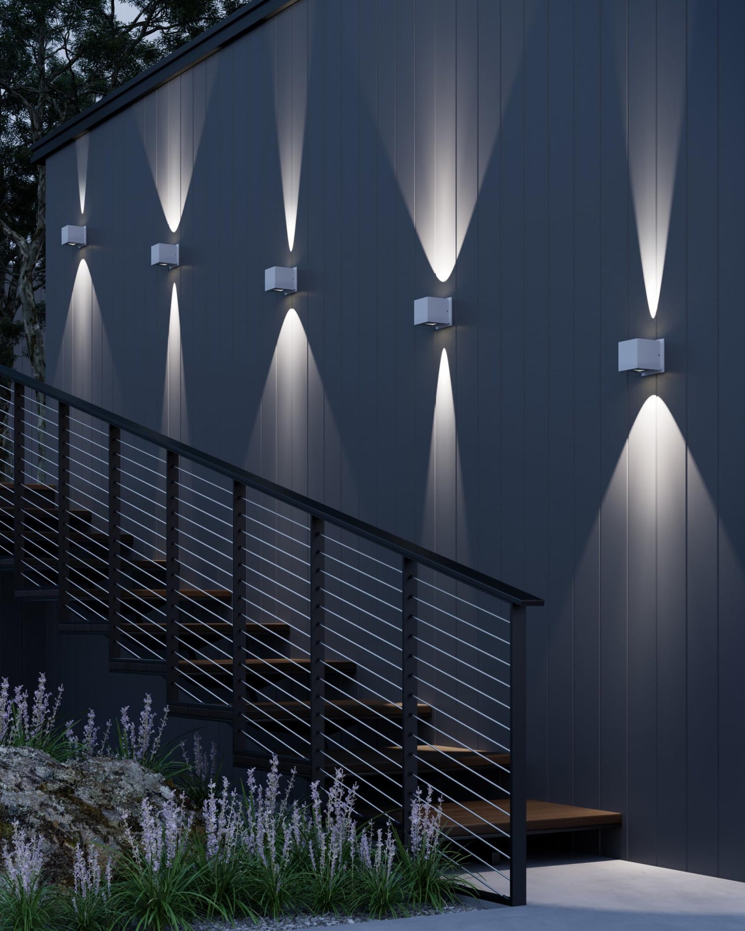 Architectural exterior wall sconce, die-cast cubic aluminum body with clear tempered glass cover and multi-faceted aluminum reflector maximizes light output. Optional beam angle plates can be installed to re-shape beam pattern.