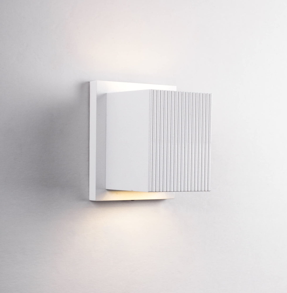 Providing uplight and downlight, this exterior wall sconce is simple and small. A black or white powder coated cube is attached to the square matching backplate with concealed fasteners. Light exits from its two 2 opposite ends whether it is mounted horizontally or vertically. A linear pin-strip patterning adds interest to the front of the cube.