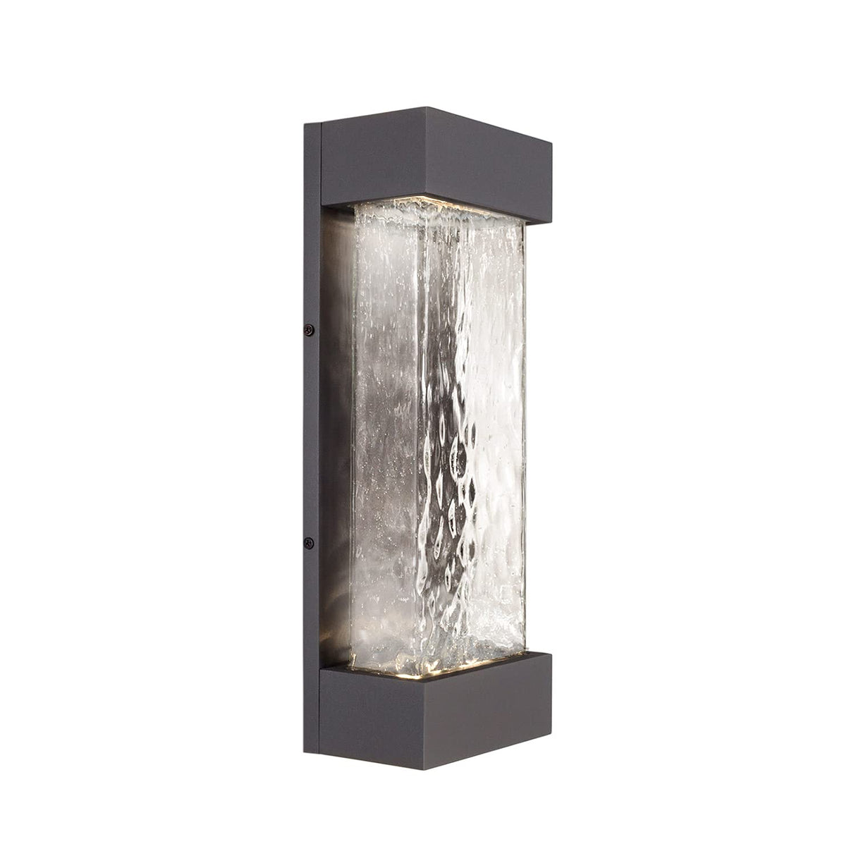 This surface mount exterior wall light combines hand-crafted glass and metal elements. Available in various lengths, this formed aluminum and art glass light glows internally to showcase the texture. While rated for exterior use, it will also look wonderful mounted on an indoor wall. Additional lights at the top and the bottom of the fixture further illuminate your space.