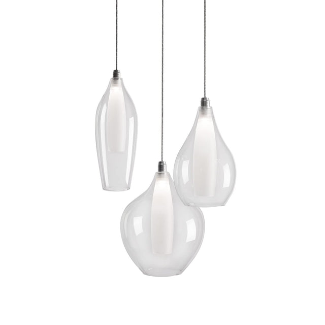 Simplistic elegant round multi LED pendant with three styles of clear outer glass and frosted inner glass each set together as one piece (slender drop, pear shaped and round drop glass shades). New patent pending socket design and Kuzco SSL wire allow this fixture to be 120V AC LED. Metal details in chrome finish. Available in three different glass styled single pendants and a variety of multi-pendant options, see series for full details.