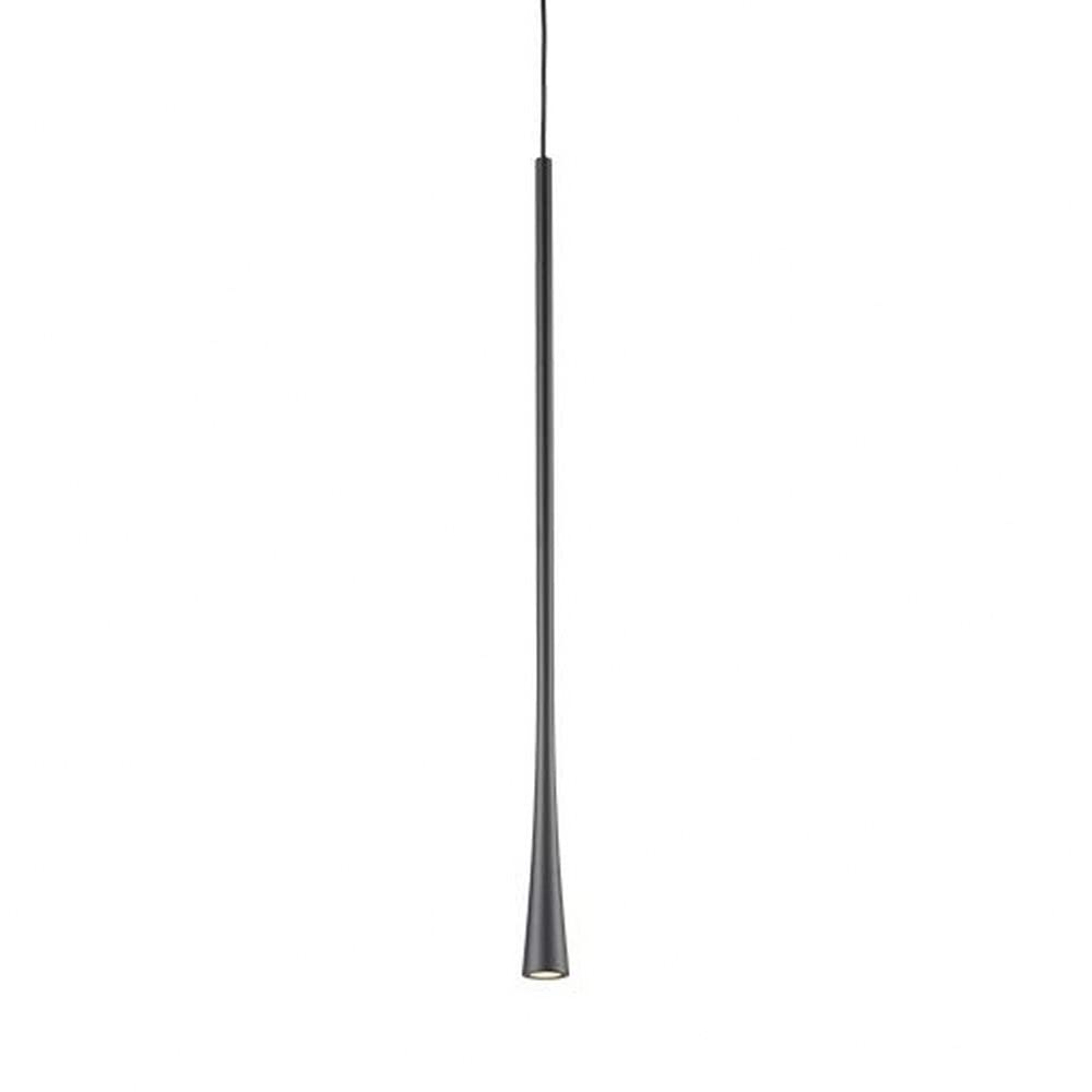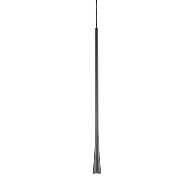 Slightly offset from the suspension cable the die-cast aluminum body repeats linear verticality with an elongated stem that flows into the conical shade. Concealing functionality in an elegant form the X lamp head integrates an LED spot assembly simultaneously serving as heatsink. The exaggerated tubular length provides aesthetic detail while acting as hang straight. Available in several curated finishes.