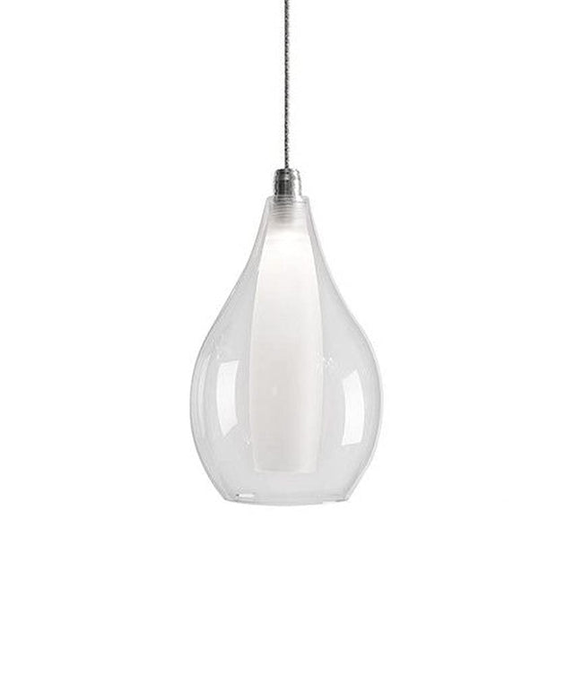 Simplistic elegant single LED pendant with a pear shaped clear outer glass and frosted inner glass set together as one piece. New patent pending socket design and Kuzco SSL wire allow this fixture to be 120V AC LED. Metal details in chrome finish. Available in three different glass styled single pendants and a variety of multi-pendant options, see series for full details.