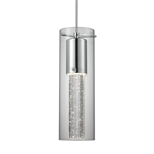 Single lamp LED pendant with encased crystal bubbles in a clear glass shade with chrome accents, and is equipped with our powerful 120V AC LED technology