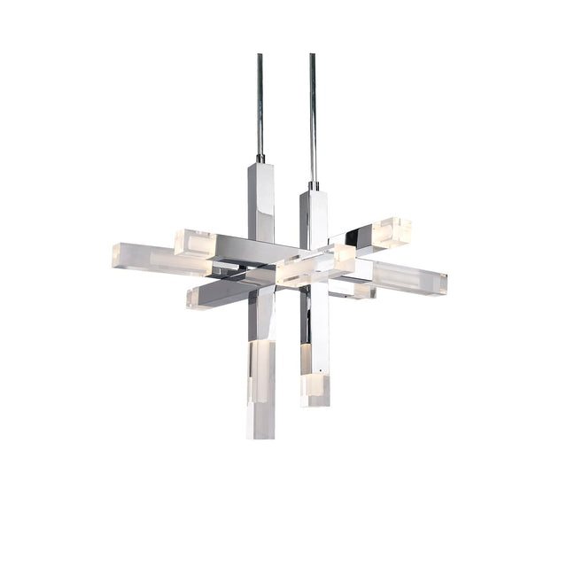 Hanging from 2 polished silver rods, this pendant uses man-made and natural elements to exude a dramatic vibe; six polished chrome bars capped with quartz-like acrylic ends are stacked perpendicularly. Clean angles and edges are highlighted by the light emitted from each end of the silver bars.