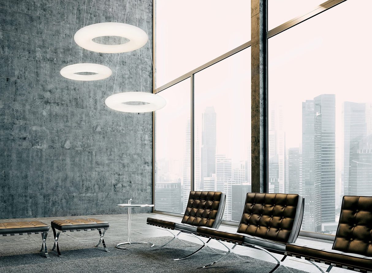 A radiant torus of bright, even illumination. Available in a variety of sizes and as either a pendant or flush mount, these halos of light adapt to any setting. Eternal and substantial.