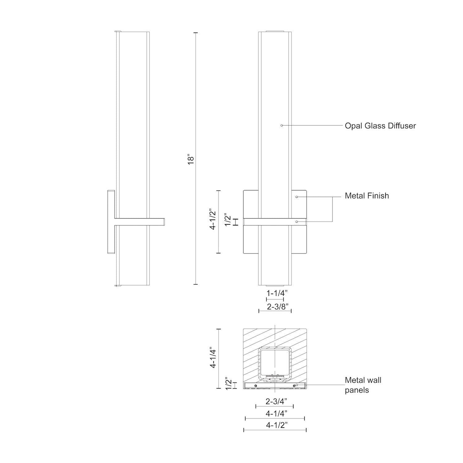 Round or square plated or painted steel frame and wall plate. Rectilinear opal glass diffuser. Outward emitting wall light. Custom options available.