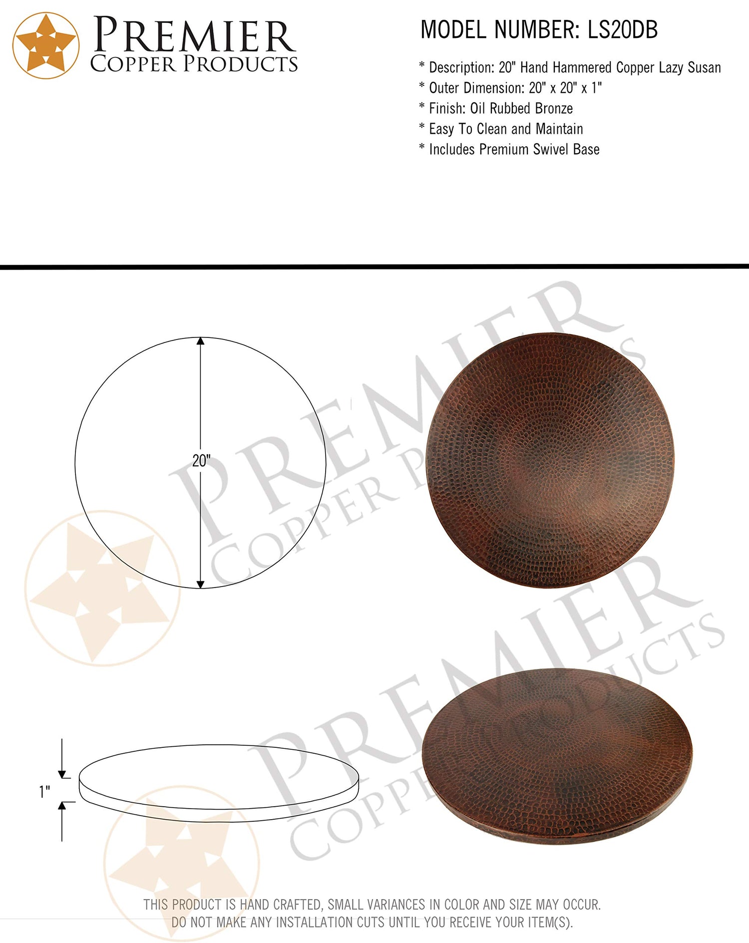 Uncompromising quality, beauty and functionality make up this Hand Hammered Copper Lazy Susan. Green recyclable products like copper sinks are a must have in todays modern home. This product is sure to impress your guests and satisfaction is always guaranteed. Features round hammered copper surface. Outer dimensions: 20-Inch by 20-Inch by 1.5-Inch. Easy to clean and maintain. Includes premium swivel base. It is hand made, made of 99.7-Percent pure recycled copper and lead free (less than 0.01-Percent). Suggested accessories: Copper Pendant Lights for Models: L200DB and L400DB, Copper Sink Wax- Model: W900-WAX, Copper Switch plates for Models: SO2, SO4, SCOT, SR1-SR4, ST1-ST4, SB1.From the ManufacturerUncompromising quality, beauty and functionality make up this Hand Hammered Copper Lazy Susan. Green recyclable products like copper sinks are a must have in todays modern home. This product is sure to impress your guests and satisfaction is always guaranteed. Features round hammered copper surface. Outer dimensions: 20-Inch by 20-Inch by 1.5-Inch. Easy to clean and maintain. Includes premium swivel base. It is hand made, made of 99.7-Percent pure recycled copper and lead free (less than 0.01-Percent). Suggested accessories: Copper Pendant Lights for Models: L200DB and L400DB, Copper Sink Wax- Model: W900-WAX, Copper Switch plates for Models: SO2, SO4, SCOT, SR1-SR4, ST1-ST4, SB1.