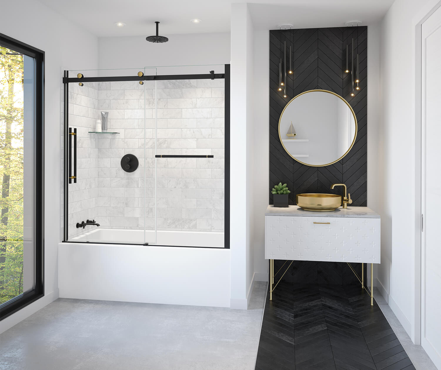 MAAX 138485-900-380-000 Vela 56 ½-59 x 59 in. 8 mm Sliding Tub Door with Towel Bar for Alcove Installation with Clear glass in Matte Black and Brushed Gold
