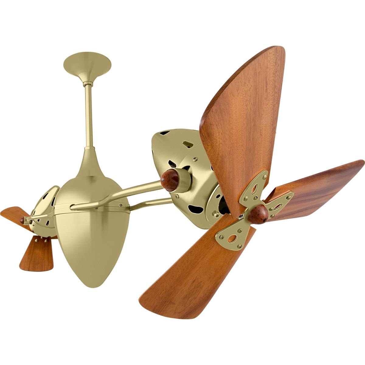 Matthews Fan AR-BRBR-WD Ar Ruthiane 360° dual headed rotational ceiling fan in brushed brass finish with solid sustainable mahogany wood blades.