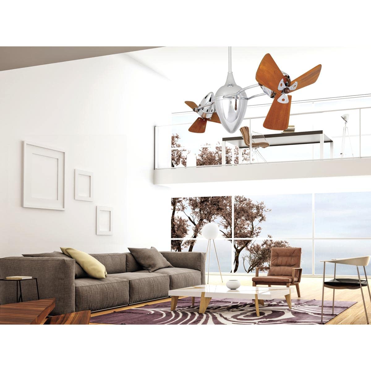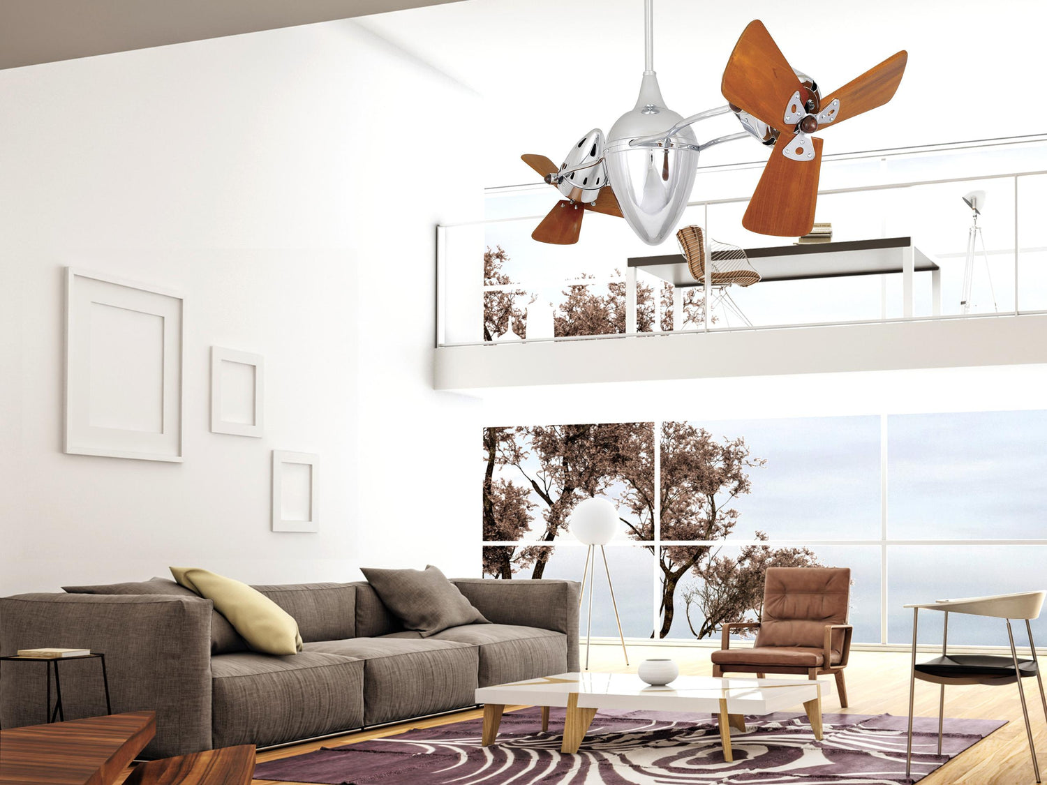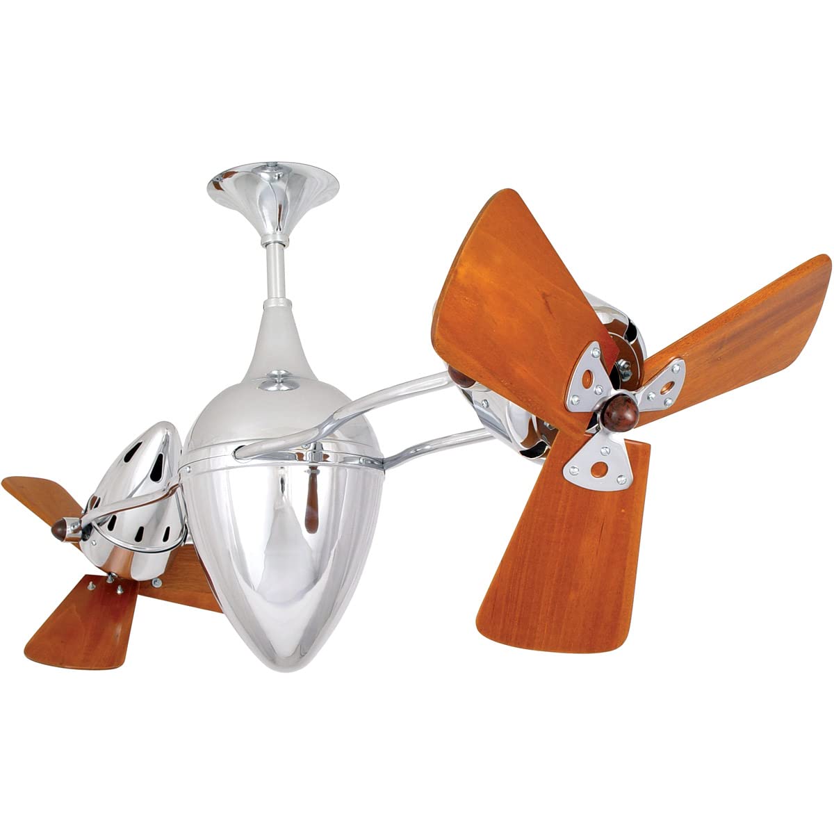 Matthews Fan AR-CR-WD Ar Ruthiane 360° dual headed rotational ceiling fan in polished chrome finish with solid sustainable mahogany wood blades.