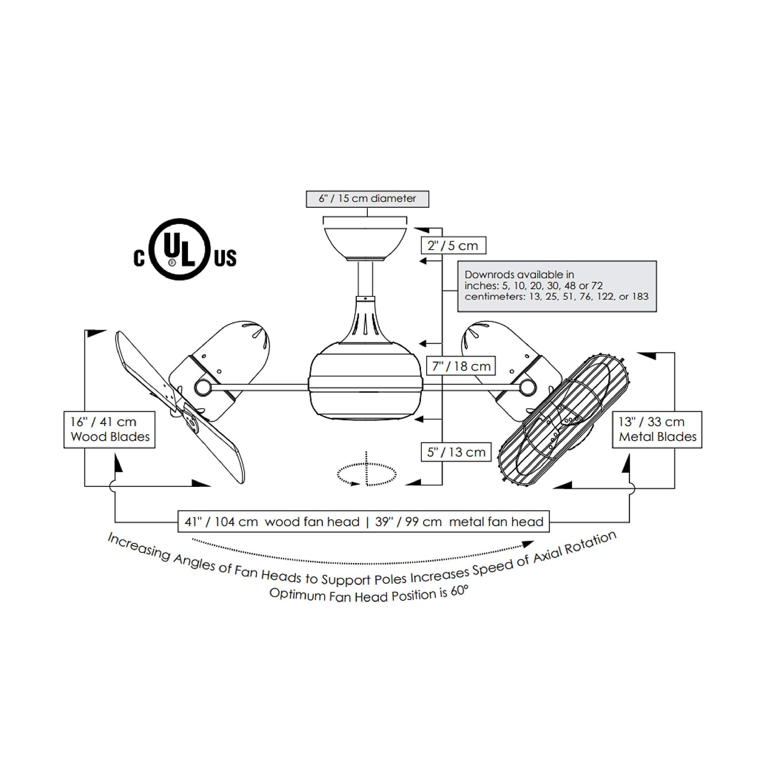 With clean, fluid lines, the Dagny LK 360° rotational fan is a striking centerpiece in any space. Its movement about its cylindrical center housing is smooth and quiet. Dagny LK’s dual fan heads can be infinitely positioned in 180-degree arcs for optimum and customized air movement. As the angle between the fan heads and the horizontal support rods is increased, so does the speed of Dagny LK’s axial rotation. Matthews rotational fans circulate heat and air conditioning more efficiently than traditional paddle fans. Constructed from cast aluminum and heavy stamped steel, the Dagny LK