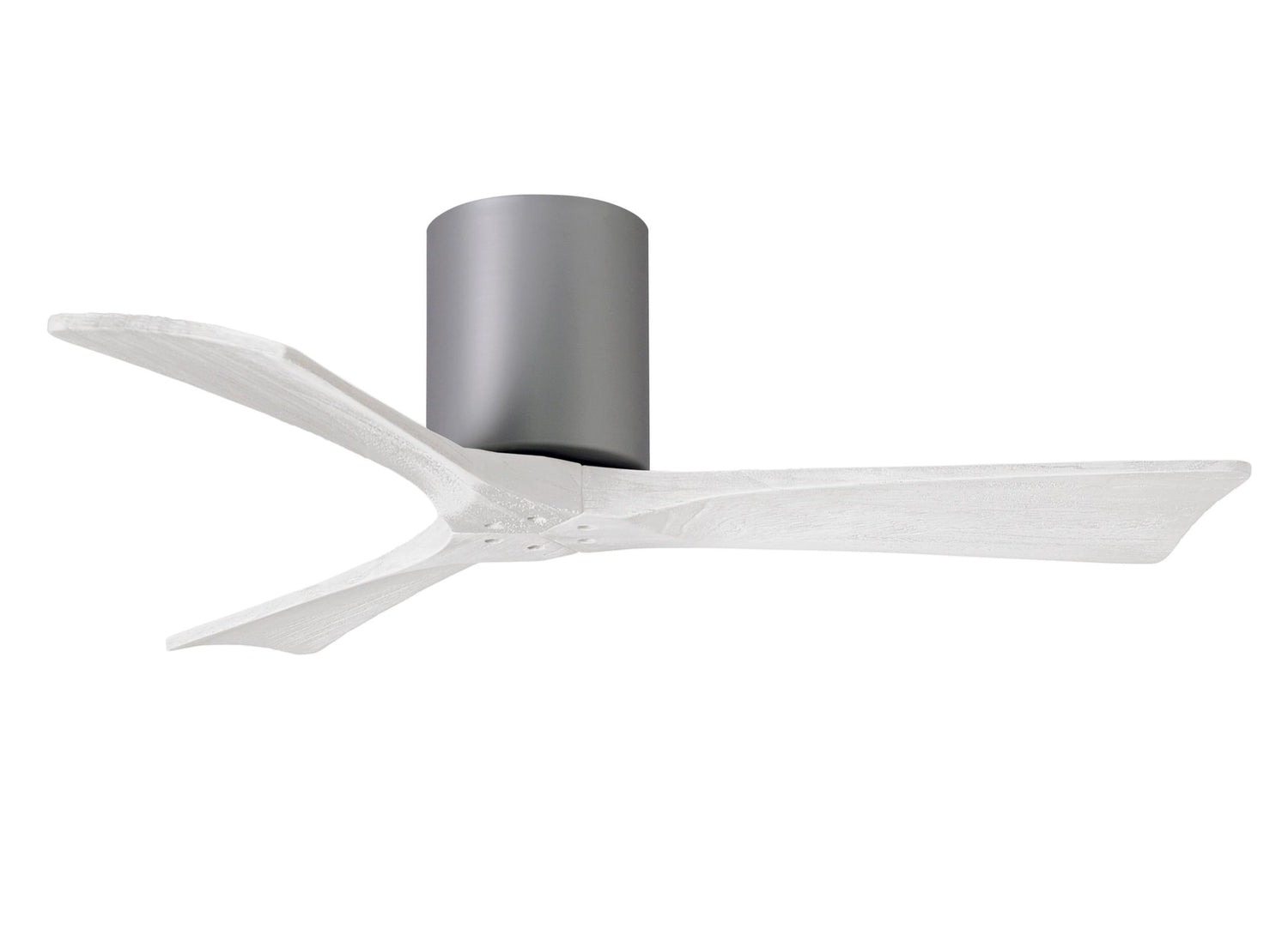 Matthews Fan IR3H-BN-MWH-42 Irene-3H three-blade flush mount paddle fan in Brushed Nickel finish with 42” solid matte white wood blades.