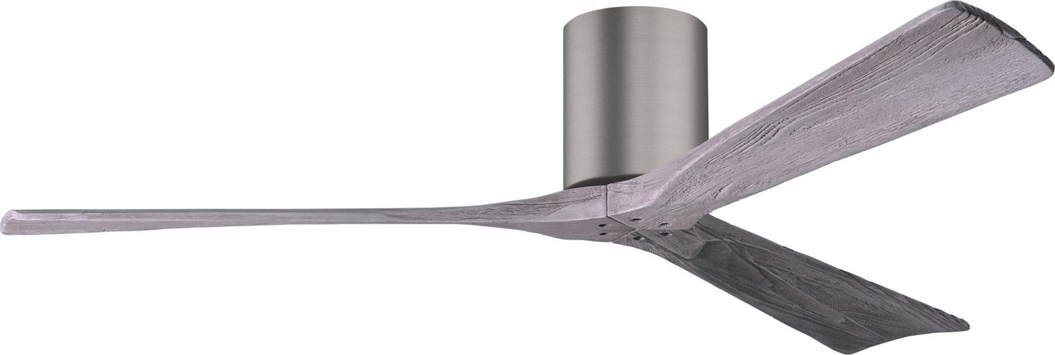 Matthews Fan IR3H-BP-BW-60 Irene-3H three-blade flush mount paddle fan in Brushed Pewter finish with 60” solid barn wood tone blades.