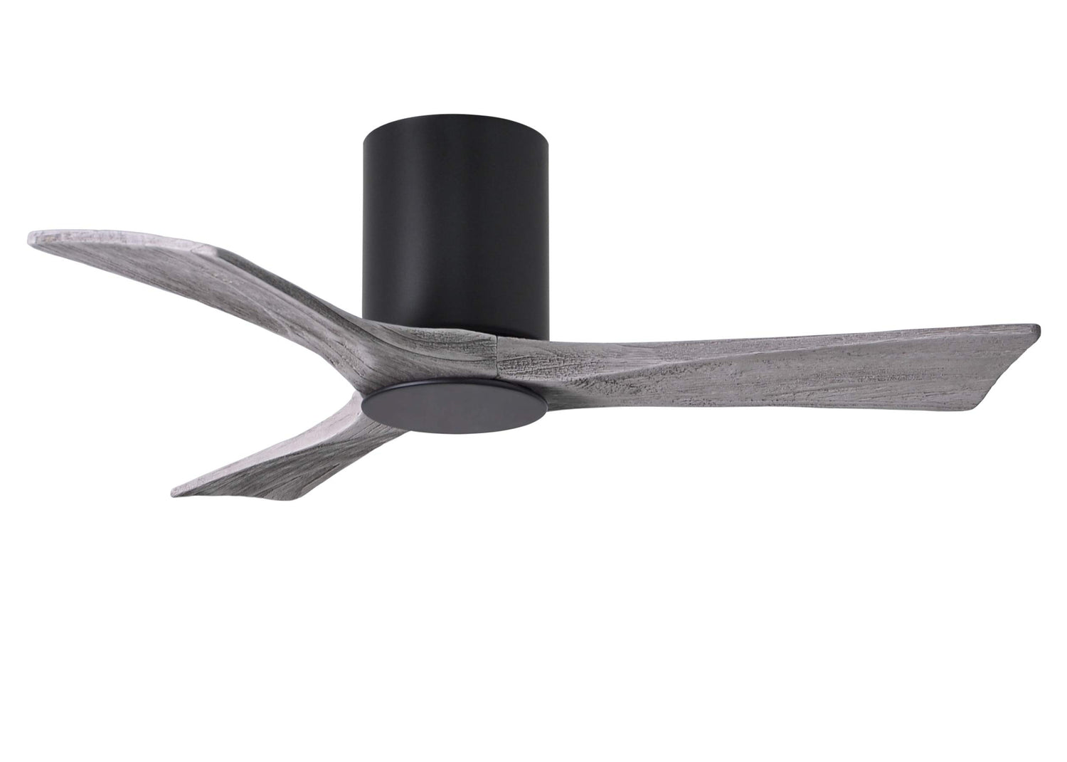Matthews Fan IR3HLK-BK-BW-42 Irene-3HLK three-blade flush mount paddle fan in Matte Black finish with 42” solid barn wood tone blades and integrated LED light kit.