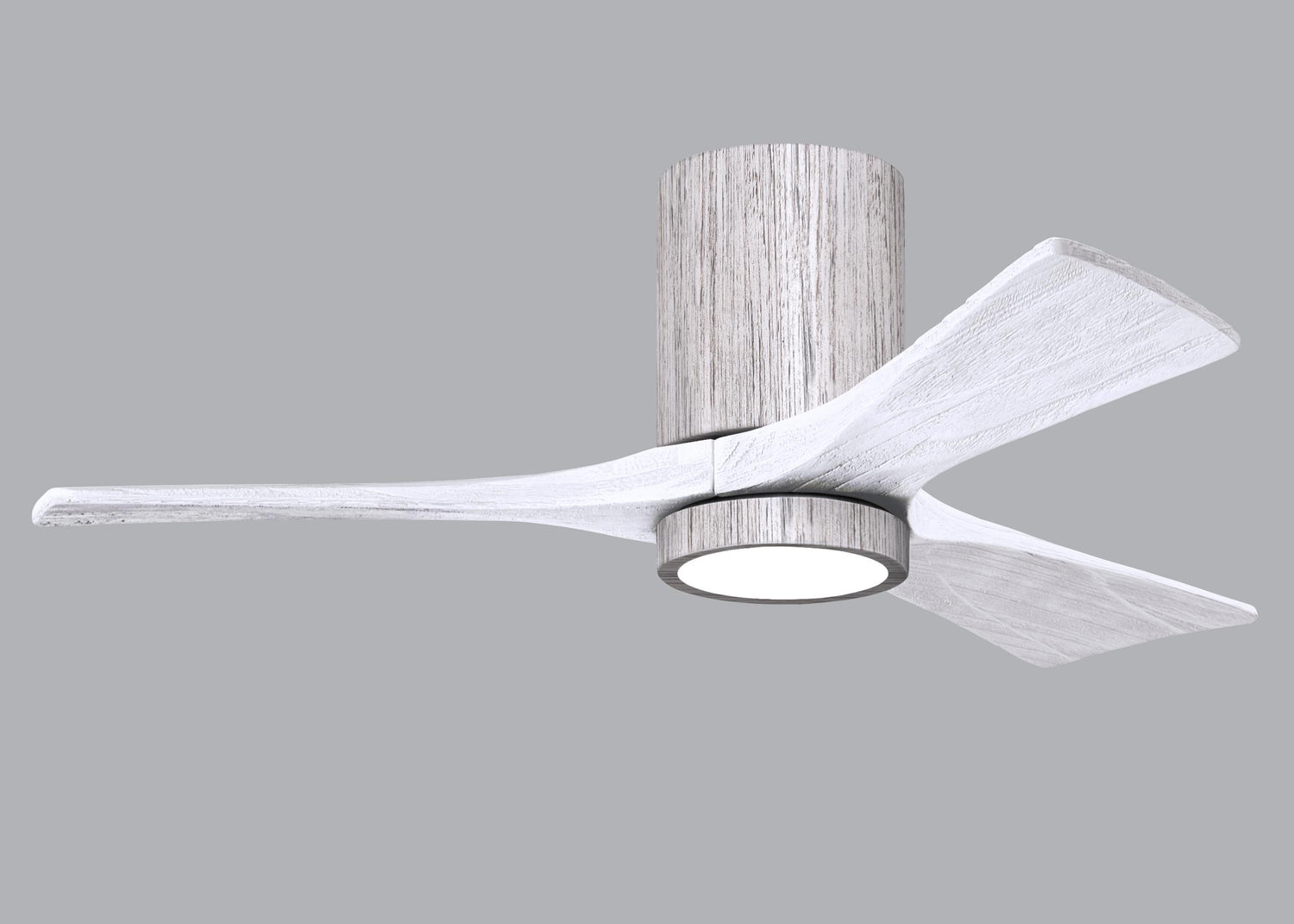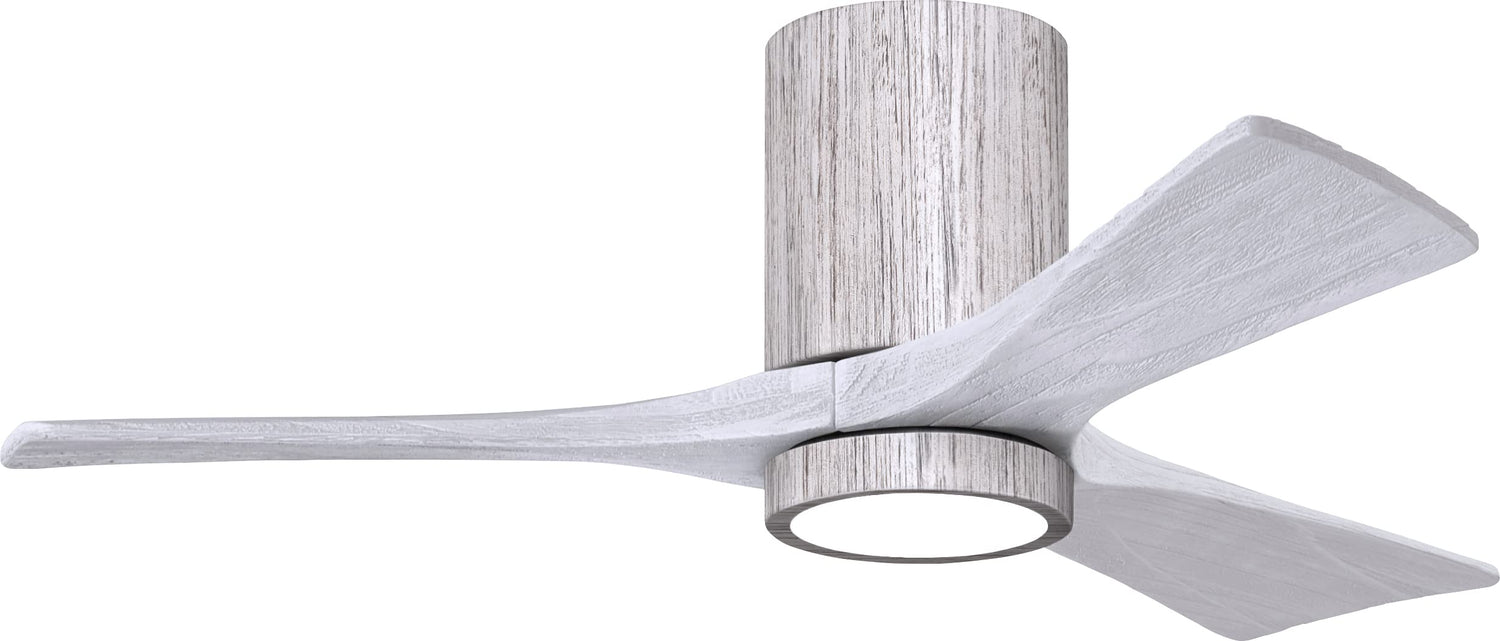 Matthews Fan IR3HLK-BW-MWH-42 Irene-3HLK three-blade flush mount paddle fan in Barn Wood finish with 42” solid matte white wood blades and integrated LED light kit.