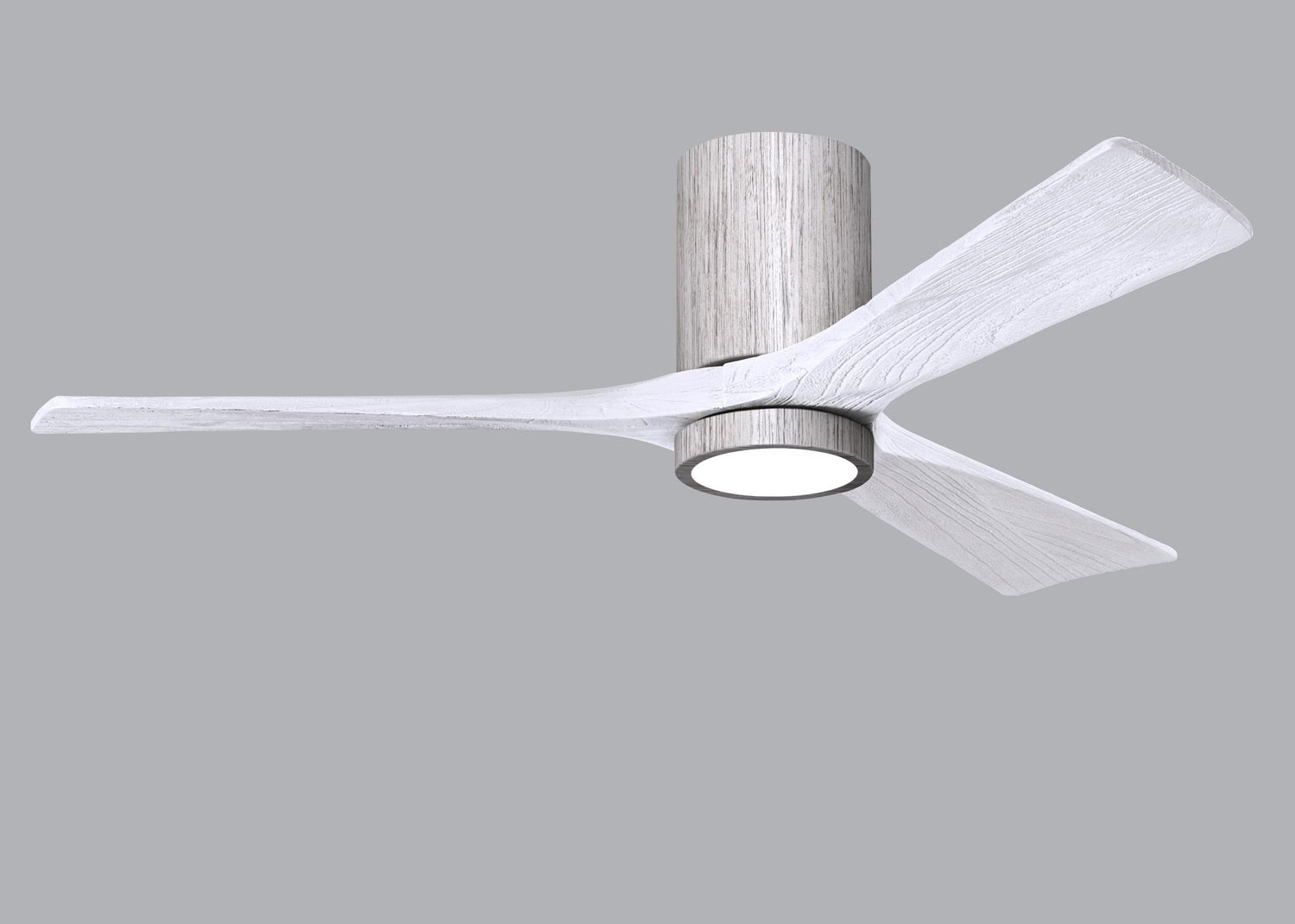 Matthews Fan IR3HLK-BW-MWH-52 Irene-3HLK three-blade flush mount paddle fan in Barn Wood finish with 52” solid matte white wood blades and integrated LED light kit.
