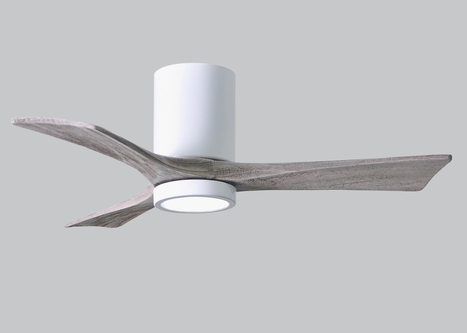 Matthews Fan IR3HLK-WH-BW-42 Irene-3HLK three-blade flush mount paddle fan in Gloss White finish with 42” solid barn wood tone blades and integrated LED light kit.